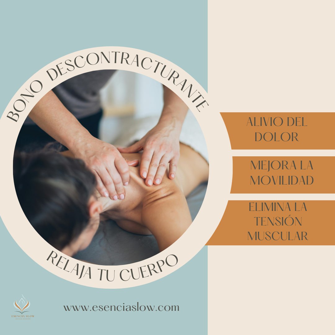 El Bono de Masaje Descontracturante es una Terapia Manual Profunda que consta de 5 Sesiones que libera tensiones físicas y desbloqueos energéticos. Trabajamos especialmente sobre cuello, espalda y hombros para ayudarte a soltar cargas acumuladas, liberar el estrés muscular y recuperar tu movilidad natural.